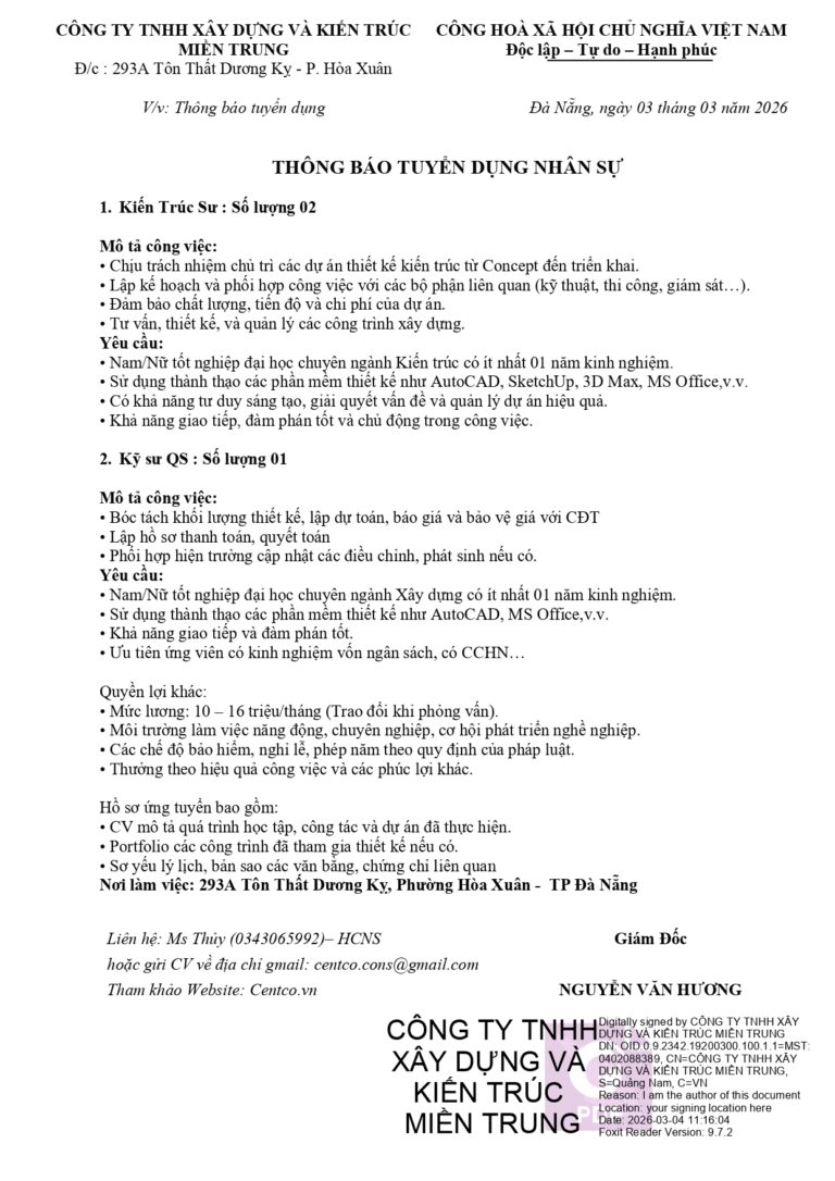 TUYỂN DỤNG NHÂN SỰ NĂM 2026 Công ty TNHH Xây dựng và Kiến trúc Miền Trung Nhằm đáp ứng nhu cầu mở rộng và phát triển dự án trong năm 2026, Công ty TNHH Xây...